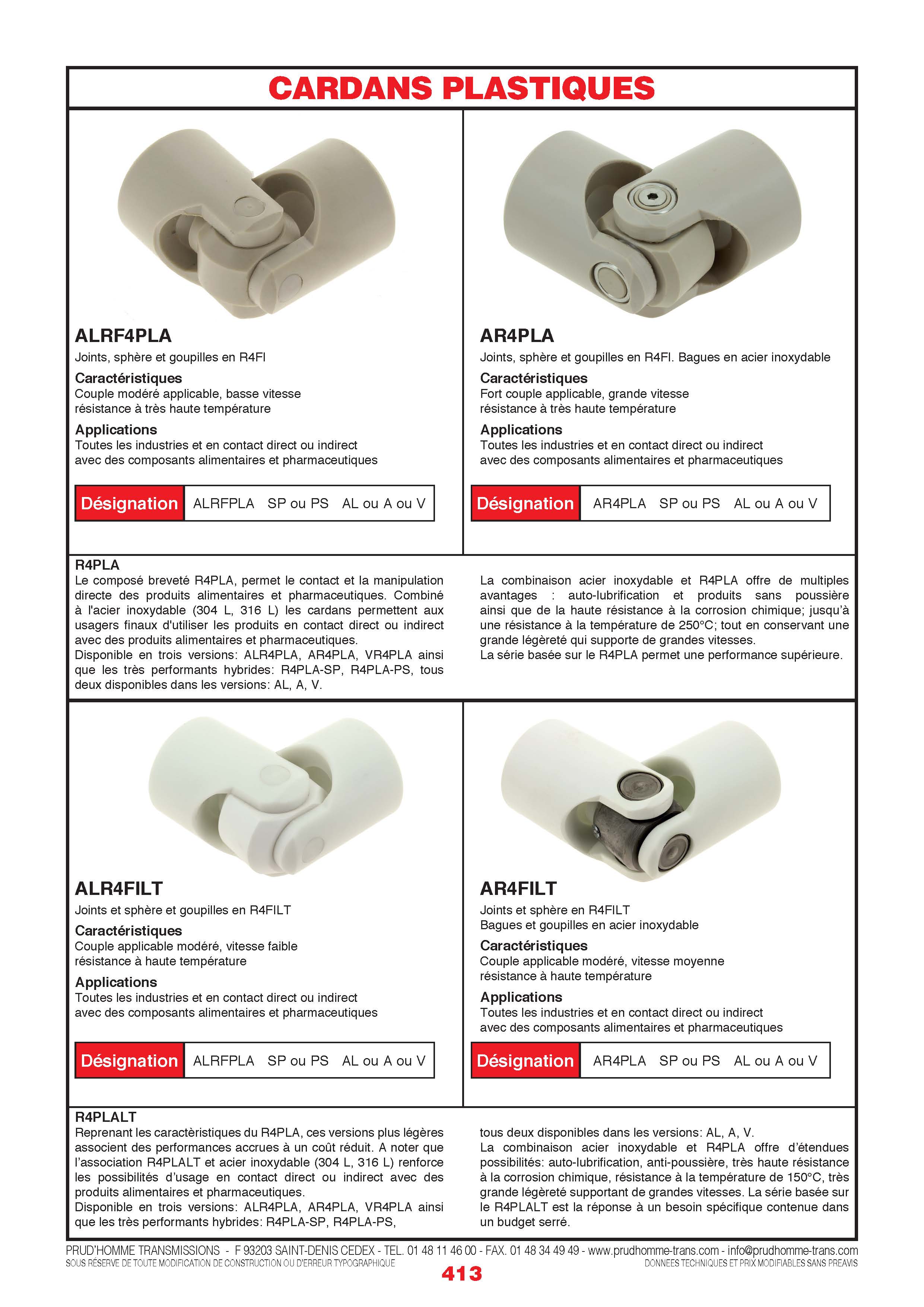 Le composé breveté R4PLA, permet le contact et la manipulation directe des produits alimentaires et pharmaceutiques. Combiné à l’acier inoxydable (304 L, 316 L) les cardans permettent aux usagers finaux d’utiliser les produits en contact direct ou indirect avec des produits alimentaires et pharmaceutiques.